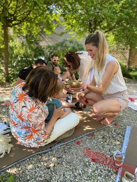 Bij de sessies met baby’s en mama’s ligt de focus meer op zintuiglijke ervaring en verbinding. Samen genieten ze van rustige momenten, zoals het ‘wakker maken’ van de voetjes via een zachte voetmassage – een klein ritueel dat zorgt voor warmte, contact en geborgenheid.