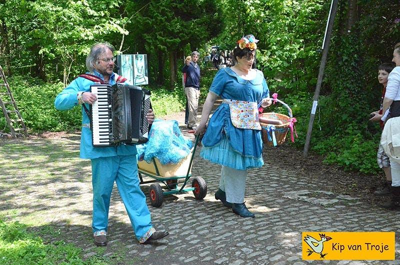 Tom en Trees - gewapend met accordeon, kleine instrumentjes, kleine geluidsversterking en stem- zoeken hun publiek bij elkaar om te vertellen en fijne liedjes te zingen.